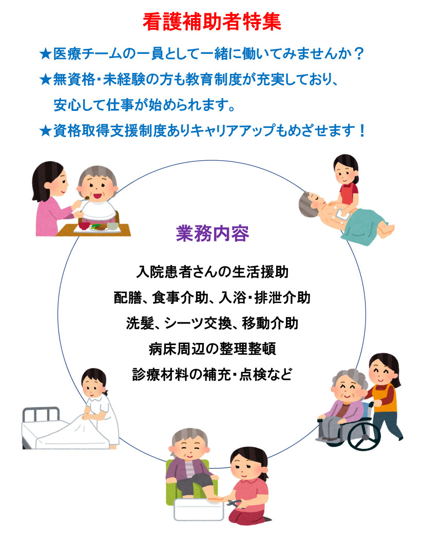 看護チームの一員である看護助手を対象に、看護ケアなど助手業務に必要な知識、技術の習得にむけ、項目ごと年間計 画を立てて指導看護師による研修を行っています。
